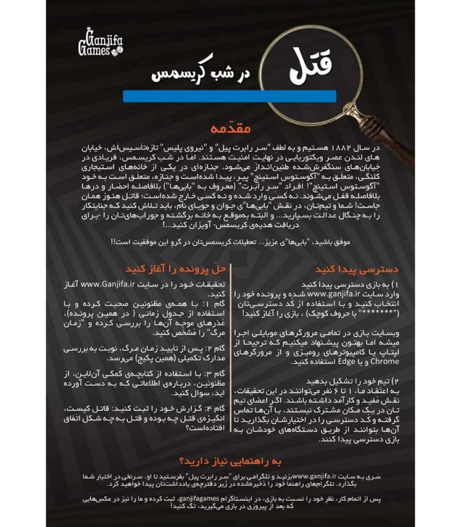 سَري به سايت ganjifa.ir بزنيد و تلگرامي براي "سِر رابرت پيل" بفرستيد تا او، سرنخي در اختيارِ شما بگذارد. تلگرامهاي کمکي خود را ذخيرهشده در زير دفترچهي يادداشتتان پيدا خواهيد کرد.